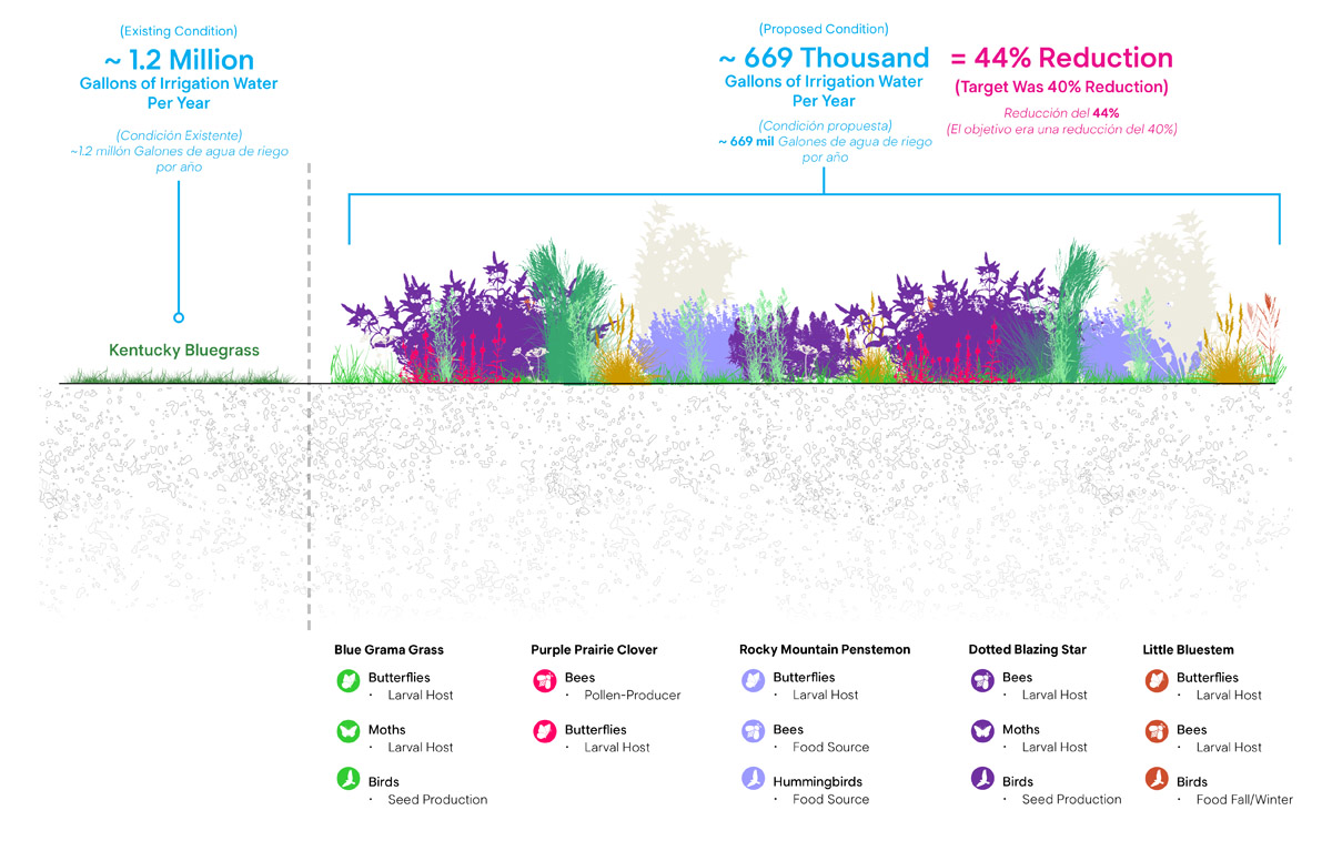 The transformation is both symbolic and functional. The new landscape will showcase the beauty and biodiversity of Colorado’s native ecosystems while dramatically reducing water use and maintenance inputs. A high-efficiency irrigation system will support establishment, but the long-term goal is self-sufficiency – a resilient landscape that thrives with less, and is built to support future generations.