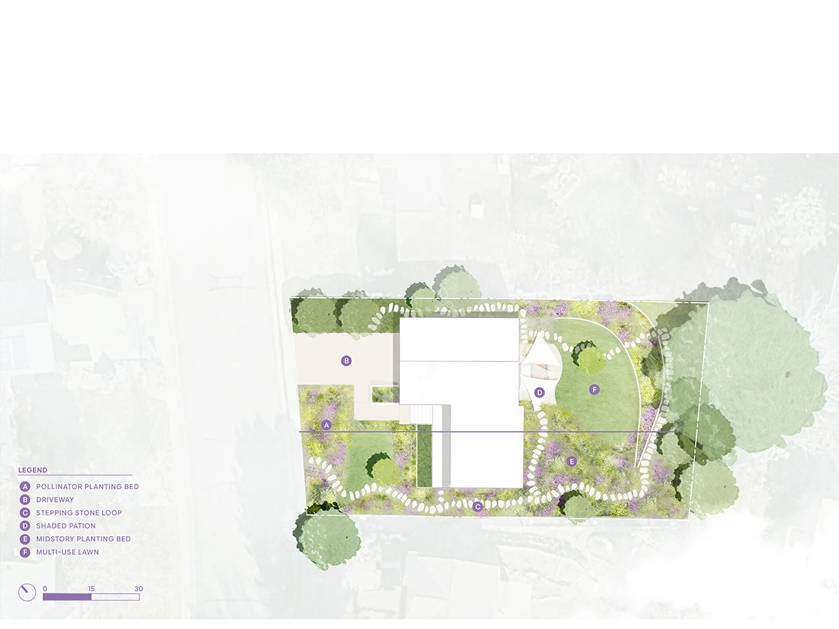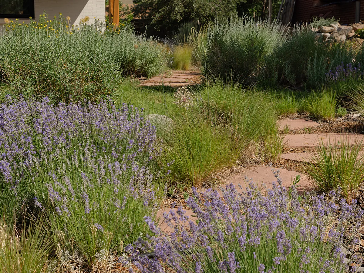 We began with what was already there. A few tough Russian sages and ornamental grasses had survived, and we salvaged them as anchors for a new planting scheme. We kept the best of what was there, but reworked the palette and planting strategy to bring in softness, color, and movement. A pollinator garden now fills the yard with a textured, meadowy mix that evolves through the seasons: penstemon and lavender in spring, bluestem and switchgrass catching the late summer light.
