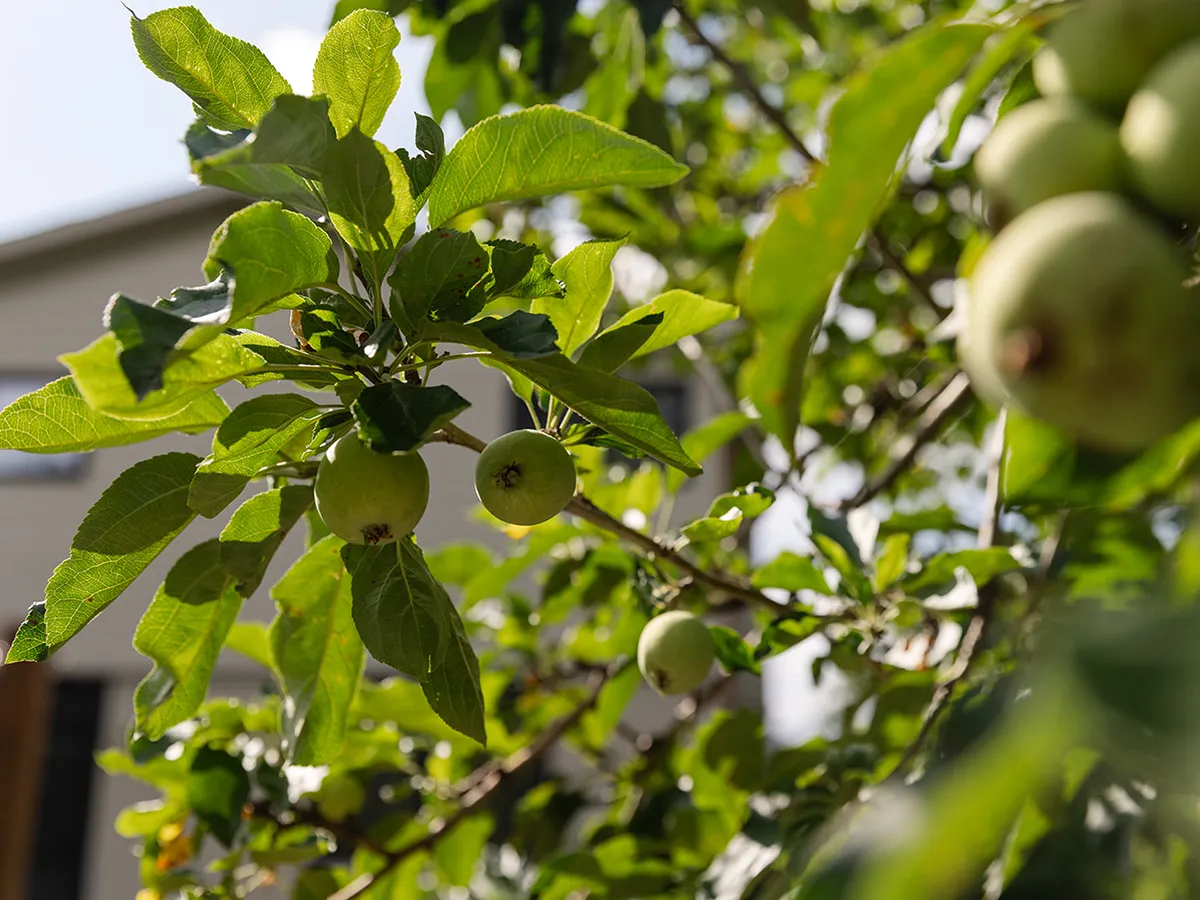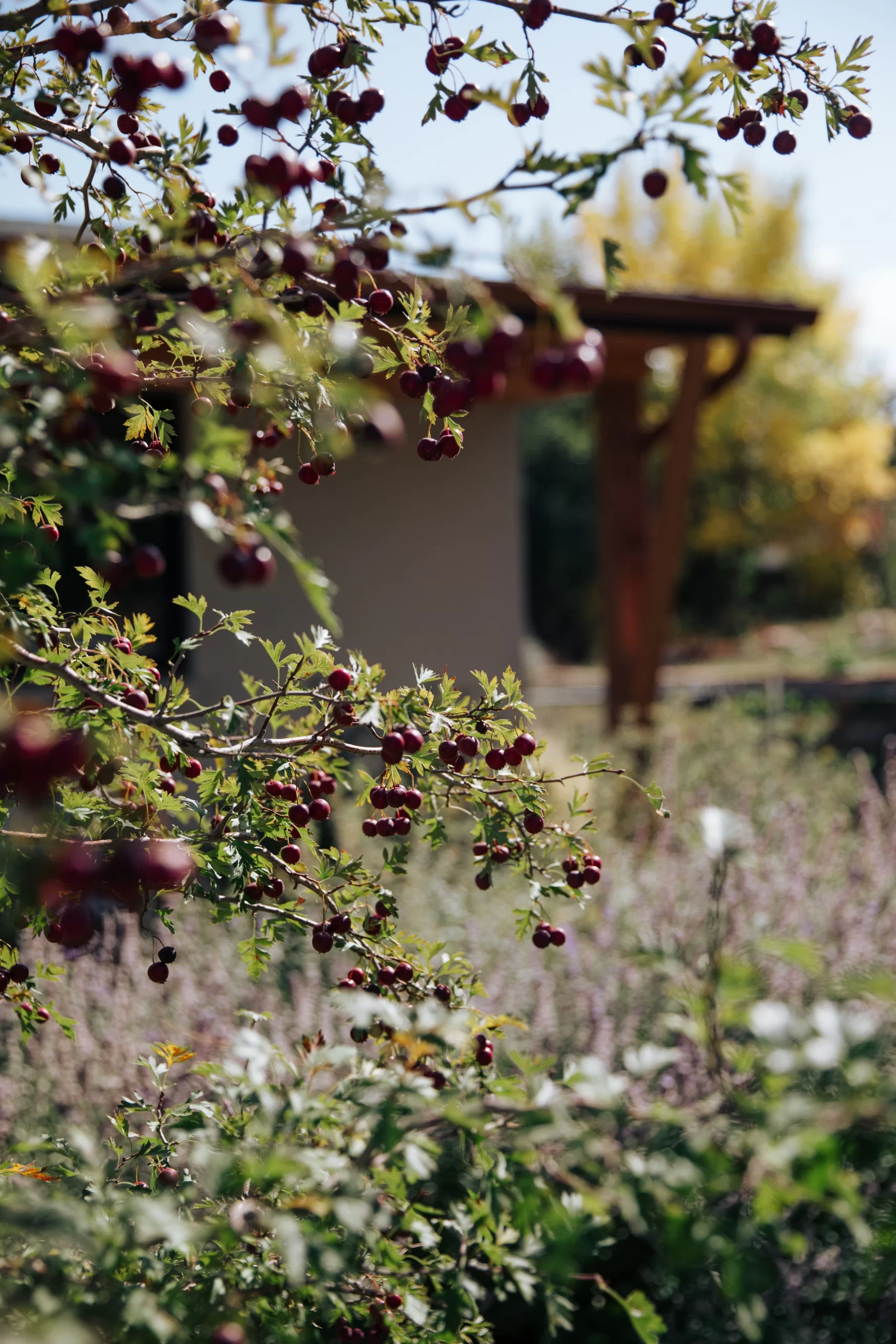 Because the home backs up to the foothills and deer are regular visitors, we prioritized resilient, low-maintenance species that could withstand a bit of browsing and still thrive. A pair of old apple trees mark the edge of the yard, so we added a hawthorn to complement them, inviting birds, pollinators, and a bit of seasonal drama. The design reflects a resilient landscape ethic, one that values durability, water-wise planting, and long-term ecological health.
