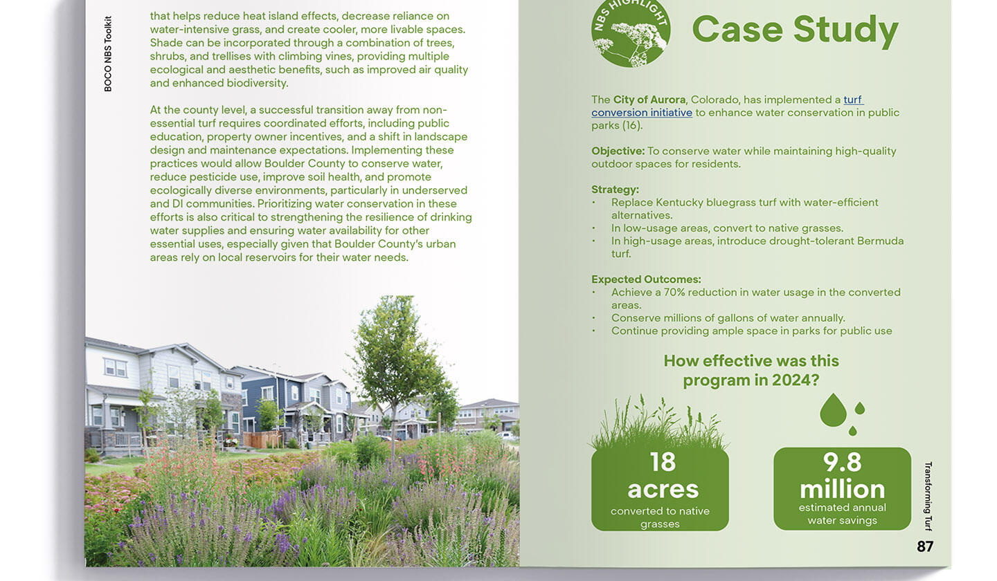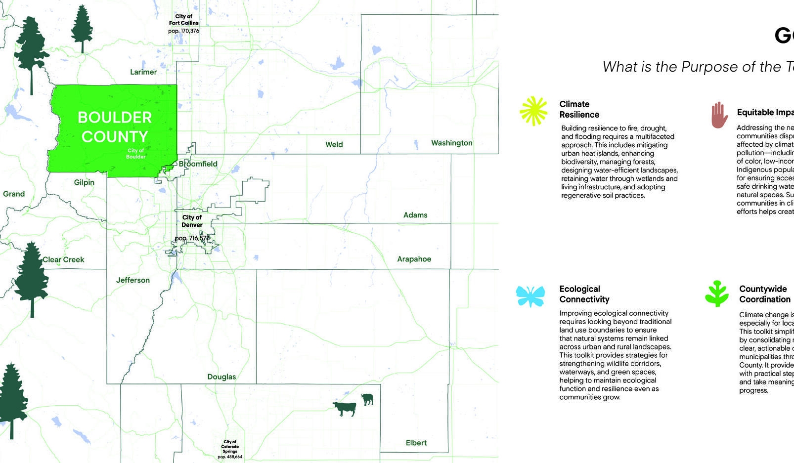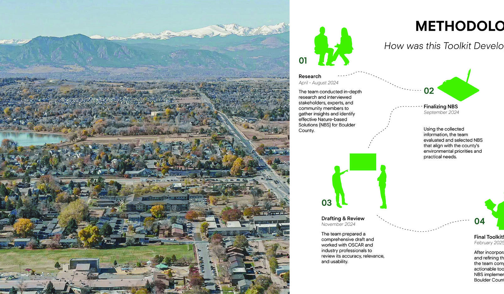 Boulder County is committed to advancing equitable climate resilience and mitigation through the expansion of nature-based solutions, such as sustainable urban landscapes, regenerative agriculture, and the improvement of forest and grassland health. The Boulder County Office of Sustainability, Climate Action, and Resilience (OSCAR) is working with Superbloom to develop a comprehensive Nature-based Solutions (NbS) Urban Landscape Toolkit. The toolkit will serve as a blueprint, containing a series of actions, policies, and case studies for Boulder County and its municipalities to take impactful action in this space.