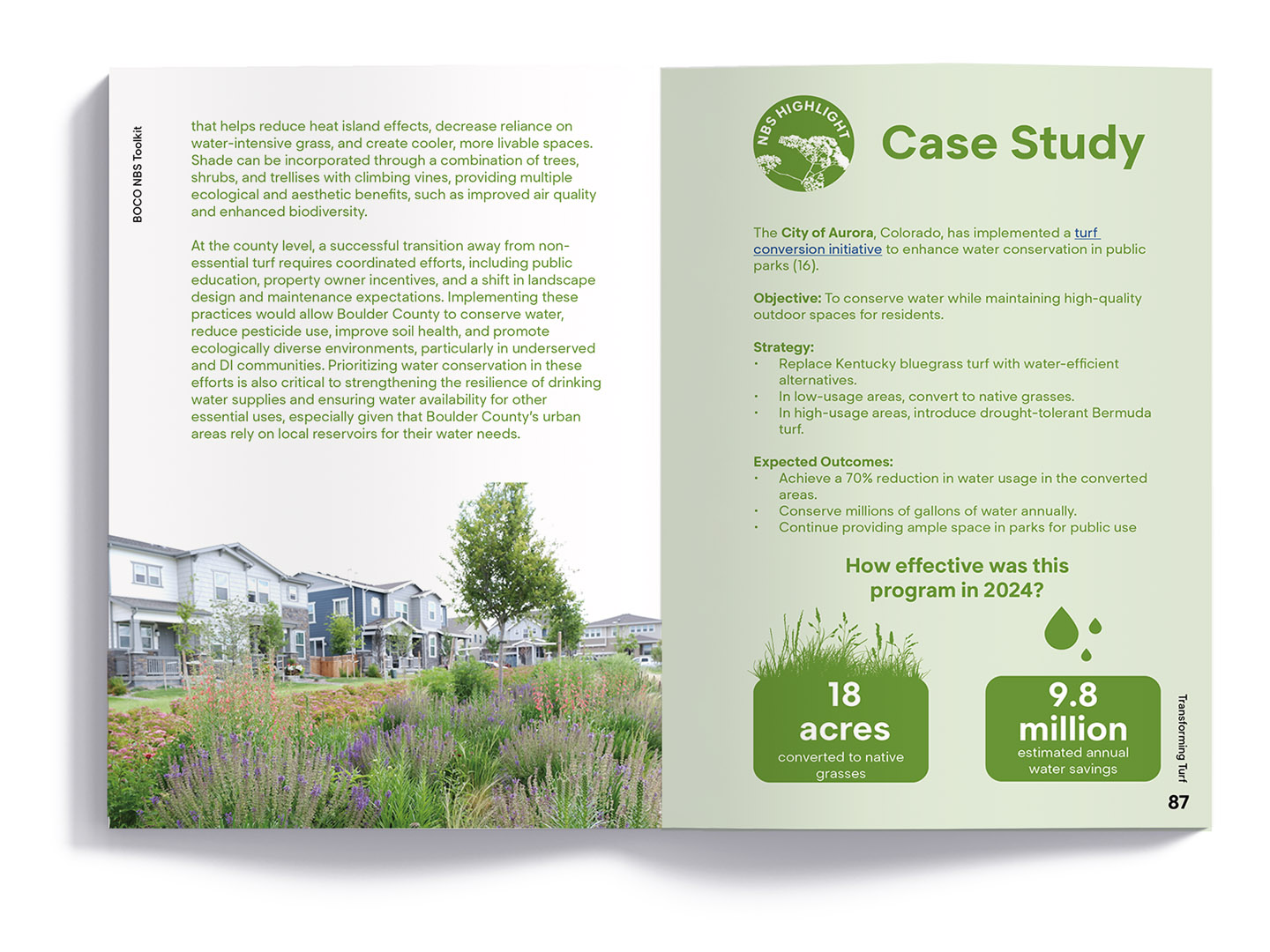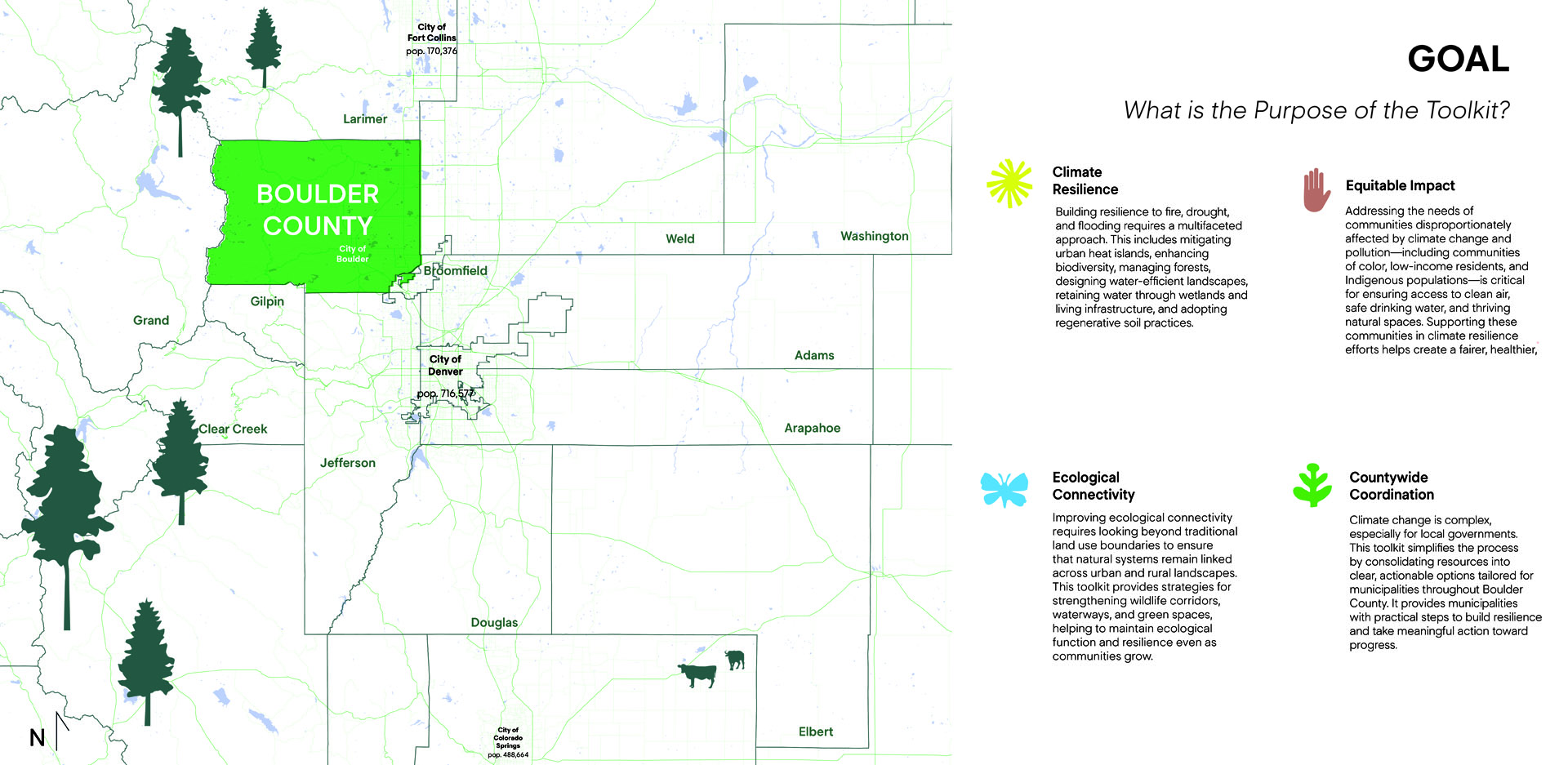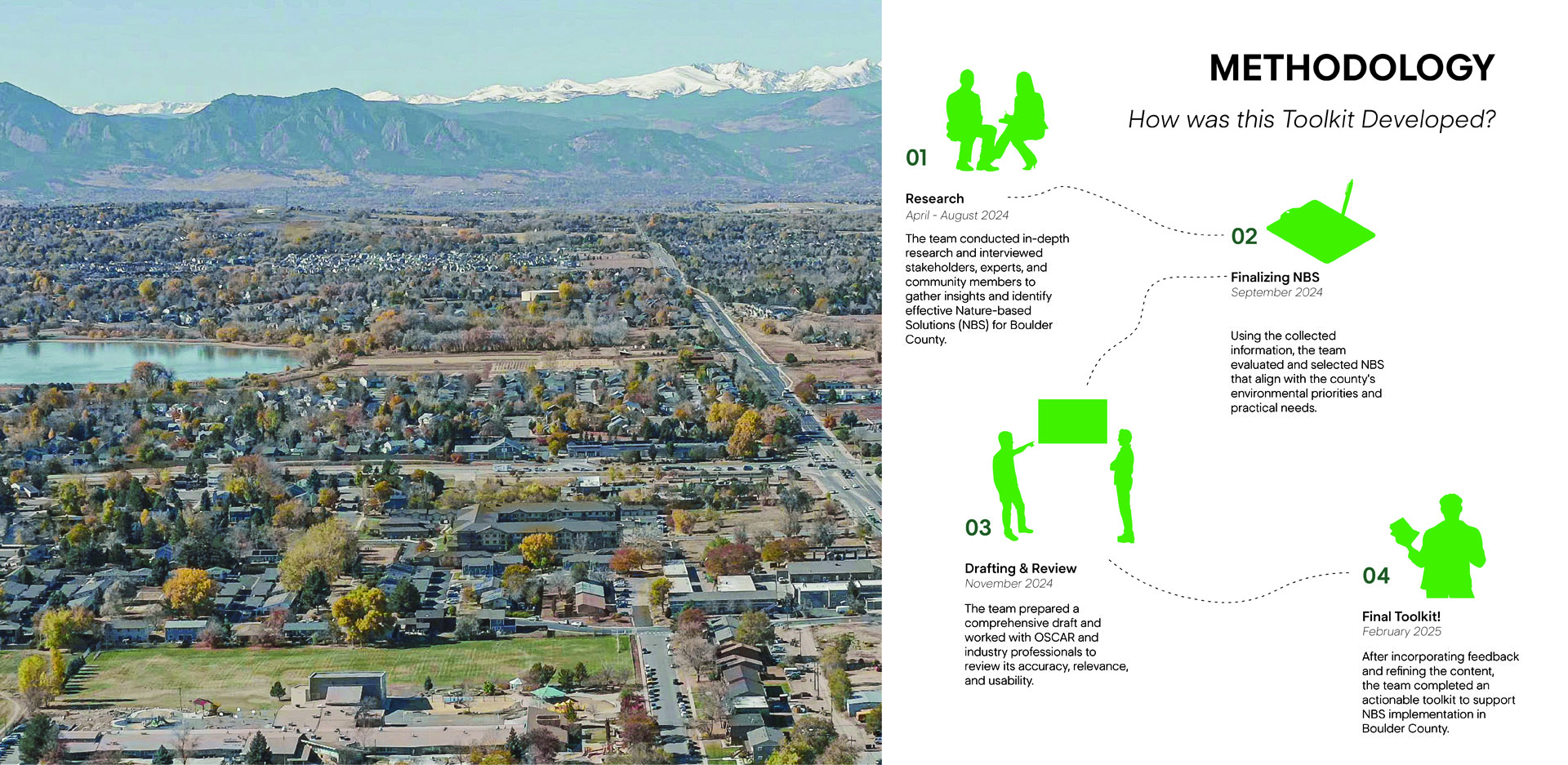 Boulder County is committed to advancing equitable climate resilience and mitigation through the expansion of nature-based solutions, such as sustainable urban landscapes, regenerative agriculture, and the improvement of forest and grassland health. The Boulder County Office of Sustainability, Climate Action, and Resilience (OSCAR) is working with Superbloom to develop a comprehensive Nature-based Solutions (NbS) Urban Landscape Toolkit. The toolkit will serve as a blueprint, containing a series of actions, policies, and case studies for Boulder County and its municipalities to take impactful action in this space.