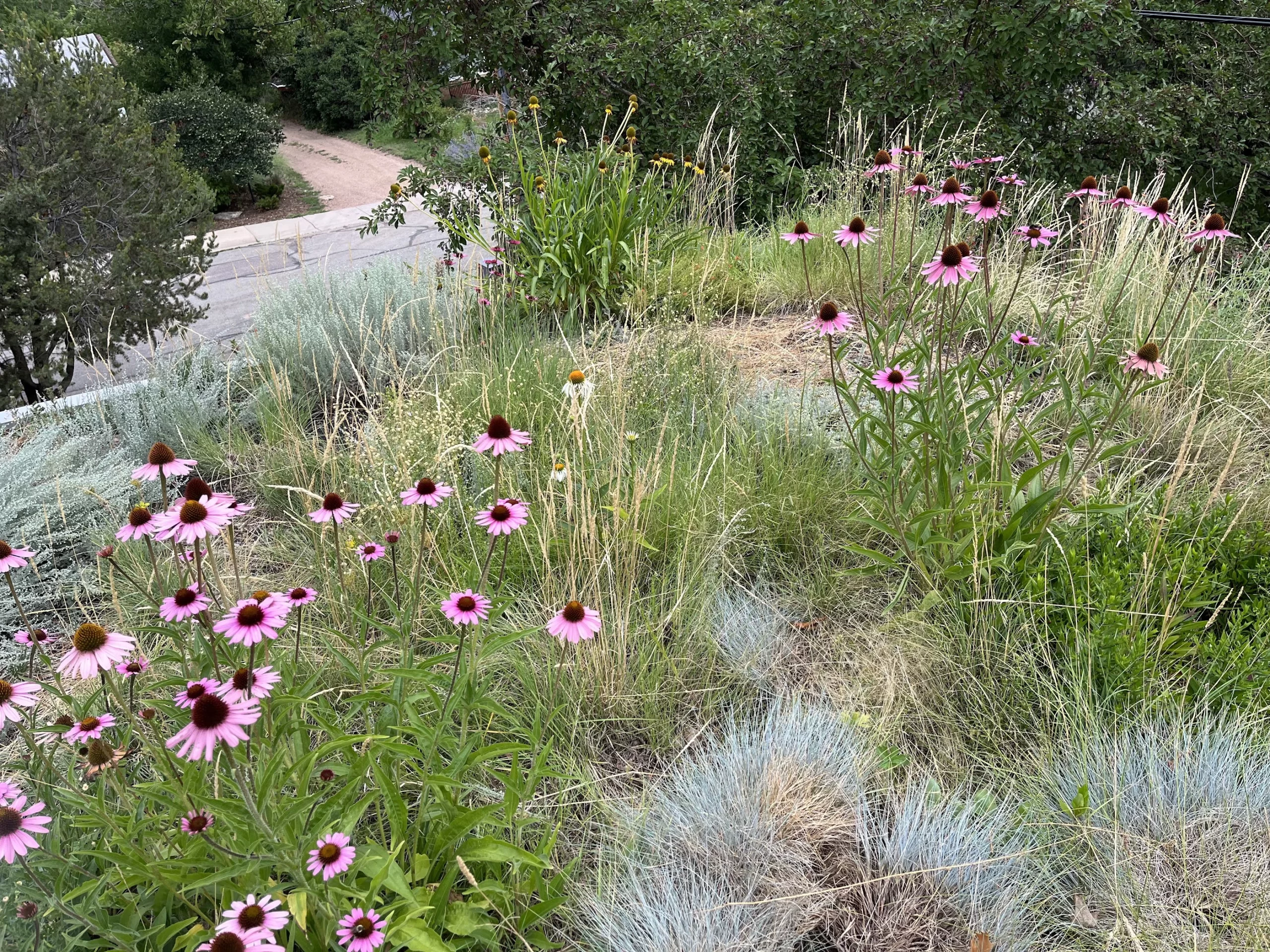 Often misunderstood as “zeroscape,” xeriscaping is actually a thoughtful approach to designing landscapes that minimize water use without sacrificing beauty. The root of the word xeriscaping comes from the Greek word “xēros” (ξηρός), which means “dry”, combined with “landscaping.” So, xeriscaping literally means “dry landscaping.” So if we go off the literal meaning of xeriscaping, most of the landscaping done in Colorado would fall under this category. Perhaps that’s why the term was coined in Colorado almost 50 years ago by Nancy Leavitt in conjunction with the Denver Water Department. It’s worth noting that while the term originated with a specific water-conservation focus, over time it has come to encompass a broader philosophy that includes soil health, native plants, efficient irrigation, and aesthetic design—not just dryness. While it’s a useful concept, xeriscaping  is often misused, and can conjure images of lifeless gravel yards—something we’re actively working to move beyond. At Superbloom, we believe xeriscaping doesn’t have to be a sum zero equation. Our goal is to create landscapes where everyone wins—from our clients and communities to pollinators, soil systems, and future generations.